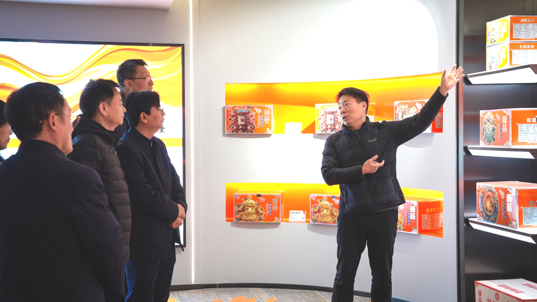 調(diào)研組全程參觀了頤和隆煙花集團(tuán)展廳,總經(jīng)理屈湘水專題匯報(bào)了頤和隆作為百年品牌的煙花發(fā)展歷程與創(chuàng)新發(fā)展軌跡。期間重點(diǎn)觀看了我司原創(chuàng)的《火藥的旅程》《追光逐焰向星?!芳啊秾?dǎo)演你的生活》三部主題宣傳片,呈現(xiàn)了集團(tuán)公司在工藝革新、藝術(shù)表達(dá)和文化傳播方面的探索實(shí)踐。